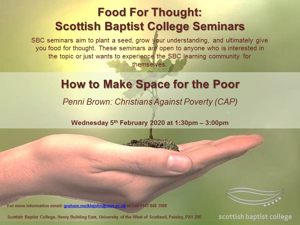 Join us at SBC for a College Community Seminars. On Wednesday February 5th between 1:30pm and 3:00pm, we’ll be hosting Penni Brown from Christians Against Poverty (CAP).